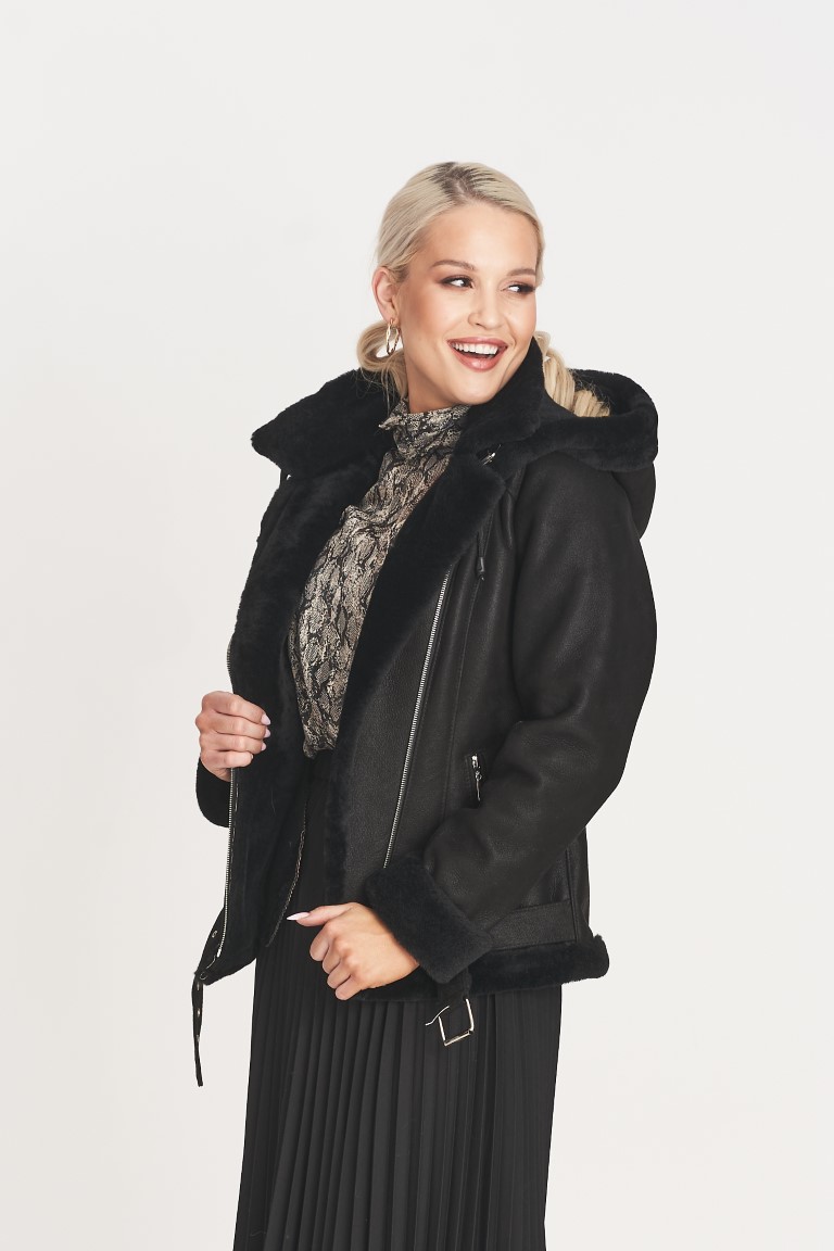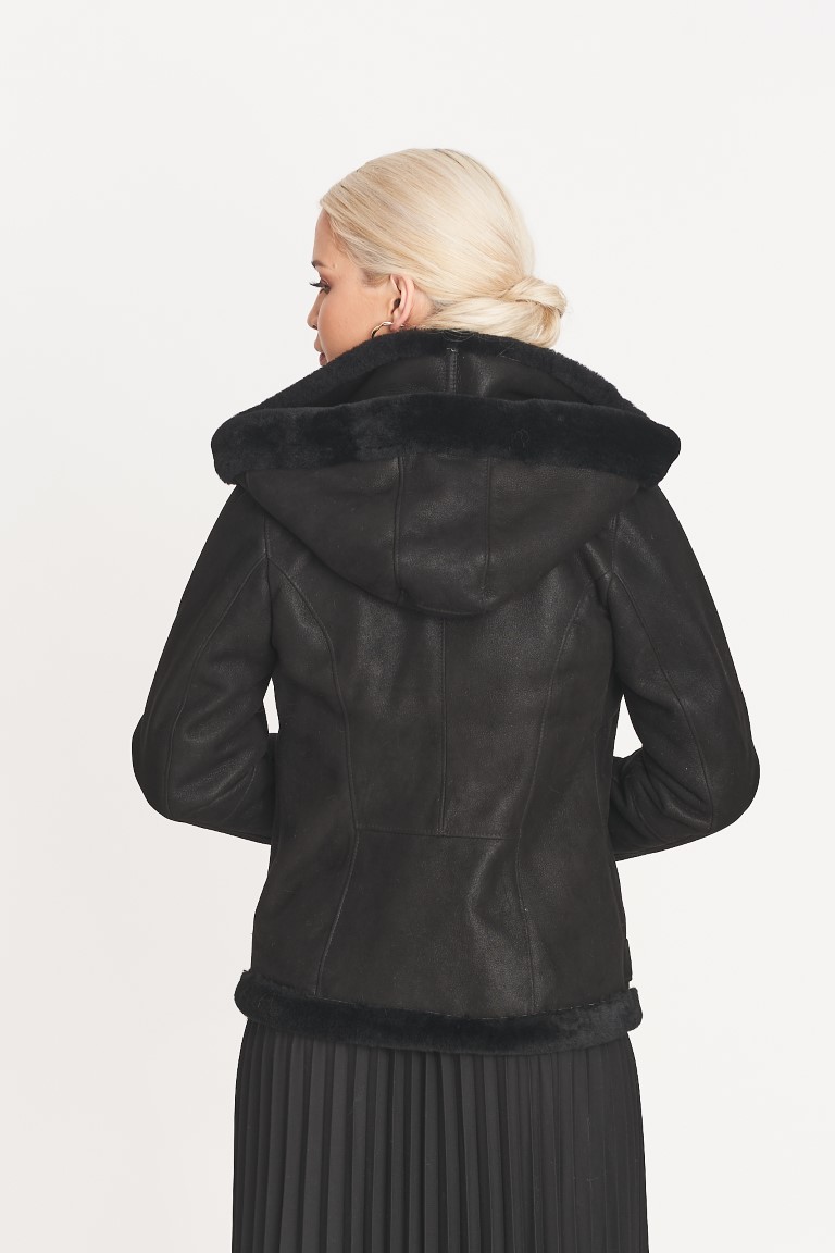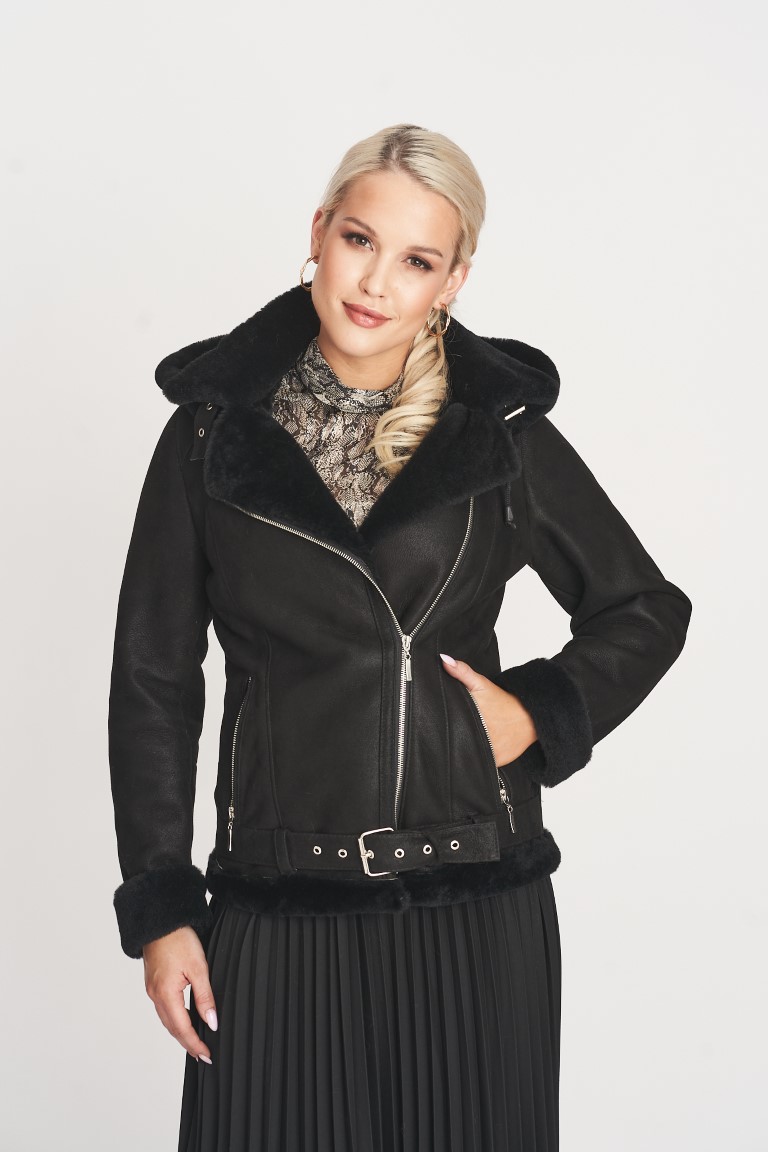 Model KD-64 wyposażono w kaptur oraz wysoki kołnierz, które razem tworzą skuteczną barierę przed wiatrem i zimnem. Oba elementy pełnią nie tylko funkcję ochronną, ale stanowią też ozdobę, dodając kożuchowi charakteru i nowoczesnego wyglądu. Proste rękawy z możliwością wywinięcia umożliwiają indywidualne dopasowanie długości do potrzeb użytkowniczki.